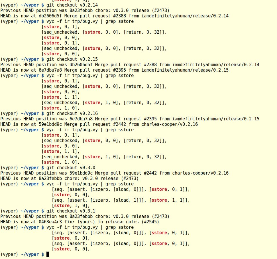 14:37 UTC Wavey helped identify the vulnerable commit and affected versions. This was also confirmed by me and Charles by manually inspecting the Vyper compiler output.